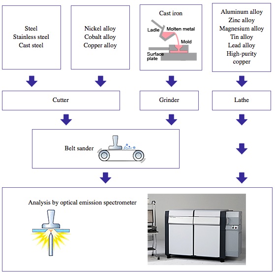 Samples are taken from molten metal, thin sheet, semi-complete or complete products. When sampling molten metal with a ladle, small quantities of molten metal are poured into a casting mold. Unnecessary parts of the sample are removed using a grinder or a cutter. As particles from a grinder may contaminate the surface of the sample, a lathe or milling machine is used (not a grinder) to cut soft samples such as white metal. If trace elements are not being investigated, a grinder or belt sander can be used. However, to minimize contamination, the grinding wheel or belt should be changed for each sample. Samples excised from semi-complete or complete products must be at least 12 mm in diameter. Small rod-shaped samples can be analyzed using special equipment.