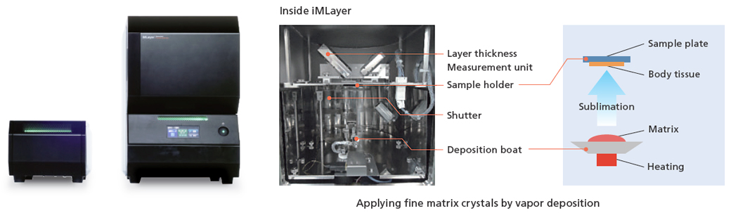 iA two-step vapor deposition method has been developed*, which provides high spatial resolution (5 to 10 μm) and high sensitivity, thanks to a combination of iMLayer (vapor deposition method) and iMLayer AERO (spray method). This unique experiment can only be implemented using Shimadzu sample preparation solutions.