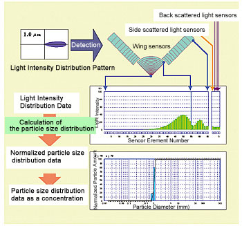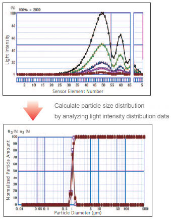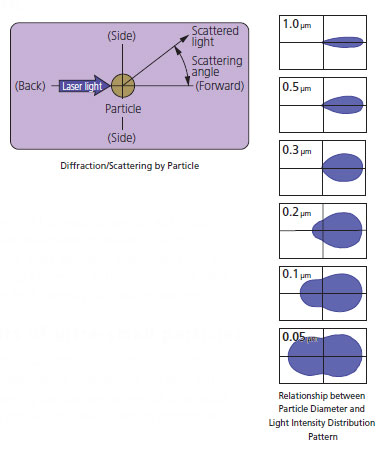 As the particle diameter becomes smaller, the pattern of the scattered light spreads outwards. As the particle becomes even smaller, the intensity of the light emitted to the side and backwards increases. The light intensity distribution pattern becomes gourd-shaped and spreads out in every direction. Therefore, there exists a one-to-one correspondence between the particle diameter and the light intensity distribution pattern. This means that the particle diameter can be ascertained by detecting the light intensity distribution pattern.