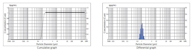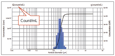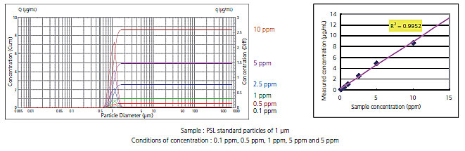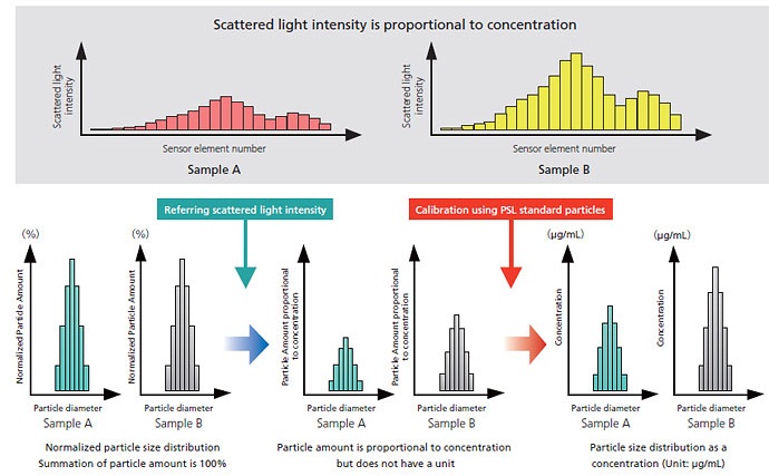 By referring to scattered light intensity, the particle amount becomes proportional to concentration but does not have a unit. Via calibration using a PSL (polystyrene latex) standard particle, we can obtain particle size distribution as a concentration (Unit: μg/mL).