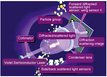 The laser beam emitted from the light source (semiconductor laser) is converted into a thick beam with a collimator, which is directed at the particle group. The scattered light emitted from the group in a forward direction at up to a 60° angle is concentrated with a lens, and concentric scattering images are formed at a detecting plane positioned at a distance equal to the focal length. This is detected with the wing sensor in which light-receiving elements are arranged concentrically. The scattered light emitted to the side and backwards is detected with side and back-scattered light sensors. The light intensity distribution data can be obtained by detecting scattered light data.