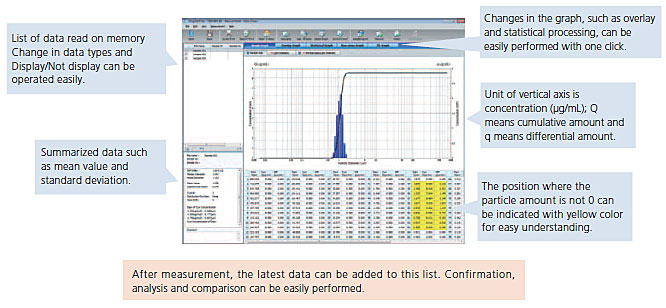 By using the “WingSALD bio” software for Aggregates Sizer, the vertical axis of the graph can become a concentration (unit: μg/mL and particle amount can be evaluated quantitatively).