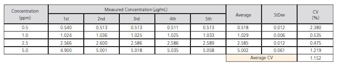 The following table shows measurement results using a PSL standard particle of 1 μm, changing the concentration conditions (0.5 ppm, 1 ppm, 2.5 ppm and 5 ppm) to confirm the repeatability. CV values for all conditions are less than 3%.
