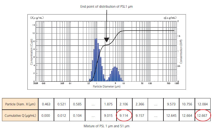 From this graph and table, we can determine that the concentration of PSL 1 μm is 9.114 μg/mL and that of PSL 5 μm is 3.553 μg/mL, which can be calculated by subtracting 9.114 from total value of 12.667 μg/mL.