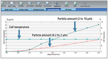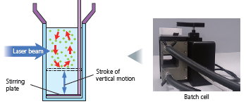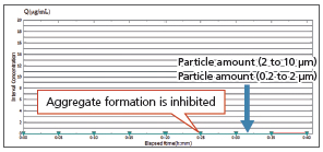 Changes (sizes and quantities) in aggregates can be confirmed quantitatively as a concentration (unit: μg/mL) at intervals as short as one second. This allows observing the status at various intermediate stages, not just at two stages, before and after such changes, which allows evaluating rates of change. Using a batch cell (5 mL sample capacity), aggregation processes can be observed as samples are mechanically stimulated.