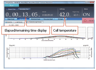 With the continuous measurement function, up to 200 data points can be measured successively (changes over time) at intervals as short as 30 seconds. During measurements, the system can display a real-time particle size distribution from current measurement data, in addition to the elapsed time and remaining time, and start processing the data measured thus far. This results in a quicker understanding of the aggregate formation process.