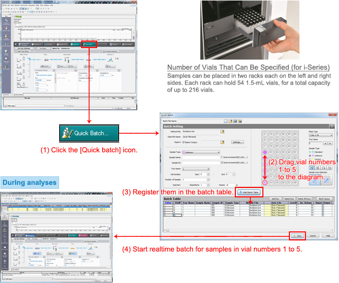 By dragging the number of vials necessary for the data acquisition to the rack diagram, the quick batch function automatically registers the corresponding information in a batch table, which eliminates the tedious process of specifying settings.