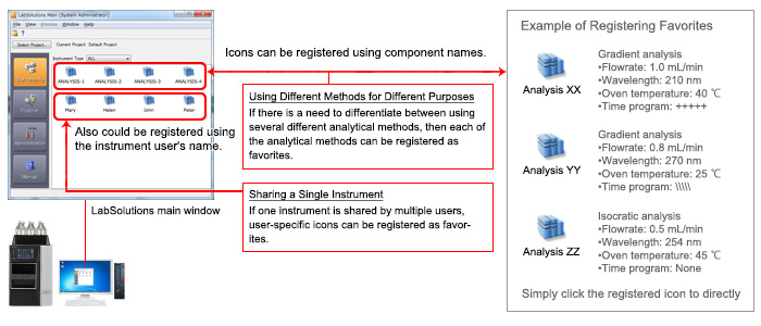 Registering Favorites Allows Selecting Instruments and Frequently Used Analytical Methods at a Glance.