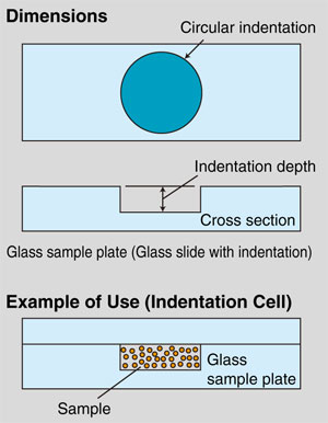 A "glass slide with indentation" can be combined with a standard glass slide to form an "indentation cell." This is effective in situations where the concentration is relative low and enclosing the sample between two standard glass slides would make the optical path length too short, and thereby make it impossible to attain sufficient diffracted/scattered light intensity.